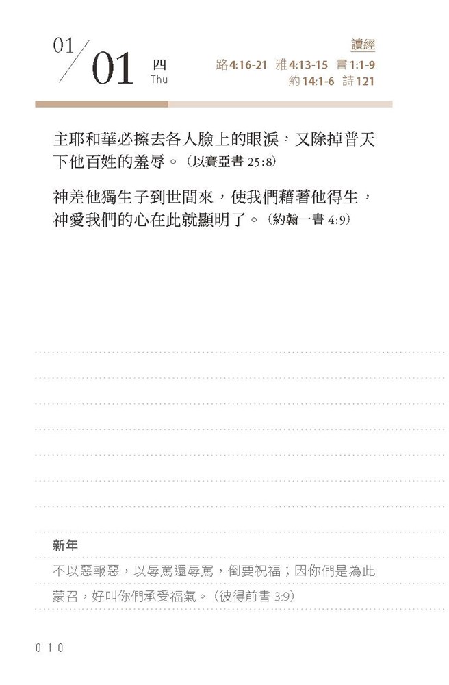 每一天都包含兩節聖經經文:一節來自舊約經文,一節則是與舊約相應的新約經文。沒有任何的釋經註釋和引申,只需以敬虔禱告尋求的心來讀,讓聖靈親自光照帶領。