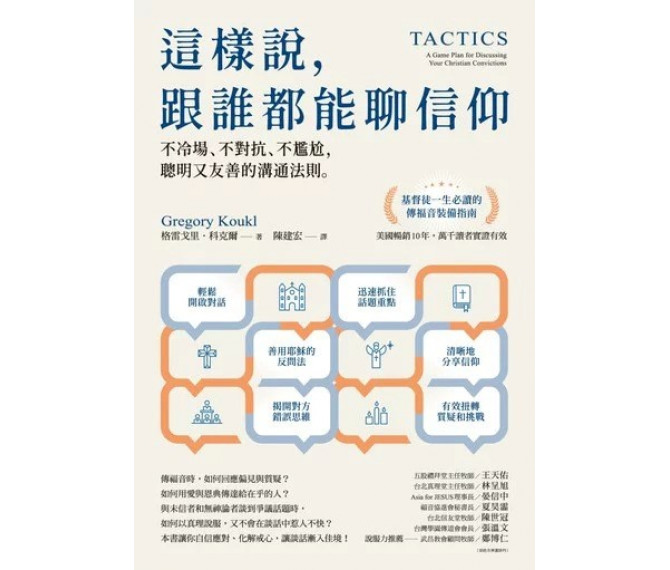 格雷戈里.科克爾的這本《這樣說,跟誰都能聊信仰》,正好為當代基督徒,補足了與人,甚至是與那些刻意與基督徒為敵的人,能夠「溫文儒雅談信仰」的技巧。但這不只是一本「技巧工具書」,更隨處藏著每位當代基督徒,都應該重新認真面對的「生命操練」與「生活實踐」的深刻省思。